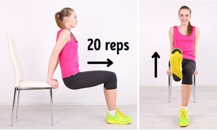 အရင်ဆုံး အခုပုံမှာ ပြထားသလို လက်နှစ်ဖက်ကို ခုံပေါ်တင်ထားပြီး ဒူးကွေးကာ အခုလိုနေပေးပါ။ ပြီးရင် ခြေထောက်တစ်ဖက်ချင်းဆီကို မြောက်ပေး ပါ။ ဘယ်ညာကိုမှ ၁ ကြိမ်လို့မှတ်ပြီး အကြိမ် ၂ဝ ဆီ ၂ ကြော့လုပ်ပေးပါ။
