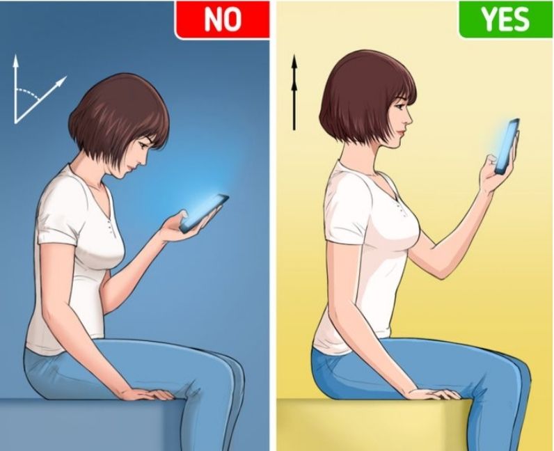 ဖုန်းတွေ၊ ကွန်ပြူတာတွေကို ကြည့်တဲ့အခါမှာ ငှဲ့ပြီး အနီးကပ်မကြည့်ပါနဲ့။ ဒုတိယပုံမှာပြထားသလို ကြည့်ပေးပါ။ ဒီလိုပုံစံနဲ့ကြည့်ကာက လည်ပင်းမှာ lines တွေ မပေါ်အောင် ကြိုတင်ကာကွယ်ပေးနိုင်ပါတယ်