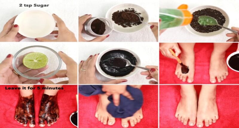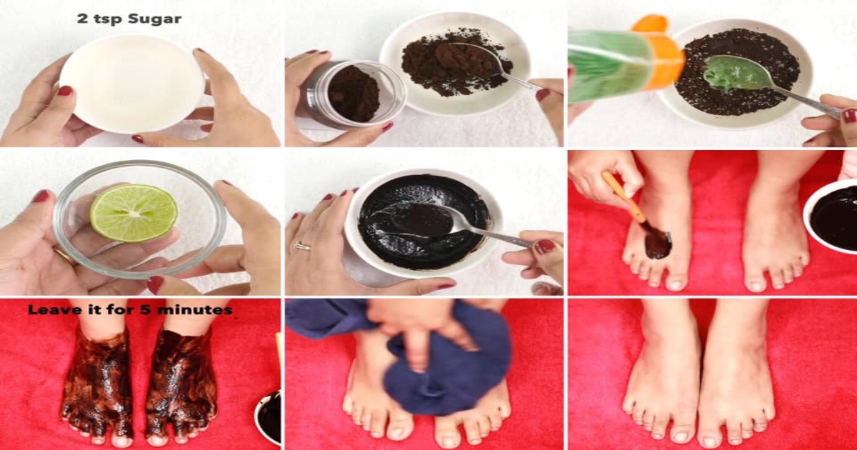 ဖျော်ထားသော ကော်ဖီမှုန့် ၊ အုန်းဆီ ဖြင့် ခြေထောက်ကို ပွတ်တိုက်၍ ၅ မိနစ်ခန့် နှိပ်နယ်ပေးပါ။ ပြီးနောက် ဆပ်ပြာနှင့် ရေဆေးပါ။
